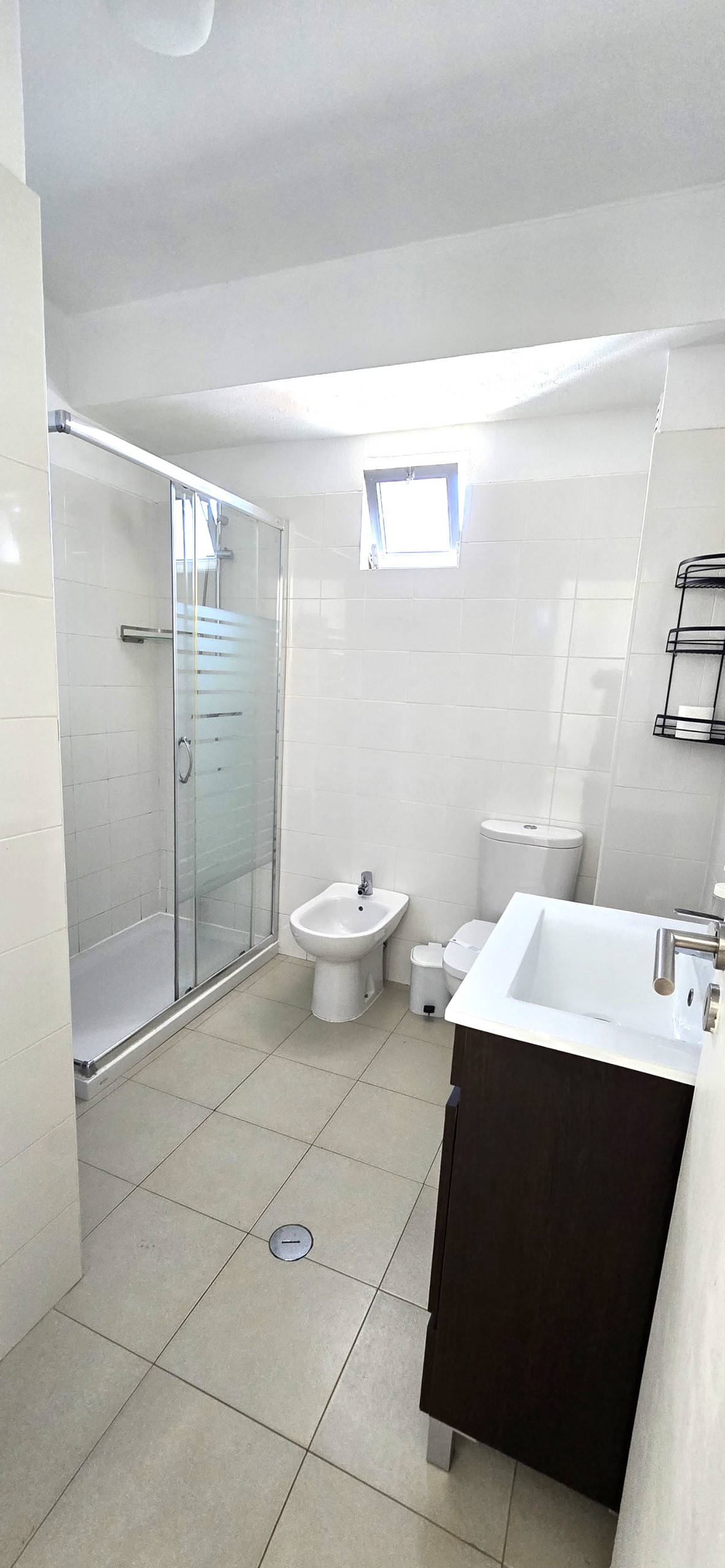 Salle de bain moderne et fonctionnelle ;